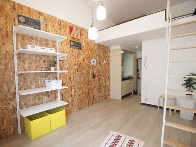 DIY NO67 Author es-reform_admin Date 2020年3月27日 ロフト付きのよくあるワンルームマンションを流行りのDIYが出来る部屋にしました。 OSBを玄関と部屋の一面に貼ってます。リフォーム費用を最小限に抑えました。